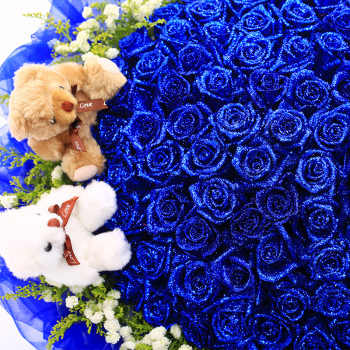 99枝蓝玫瑰(即蓝色妖姬,昆明产),黄莺,满天星外围