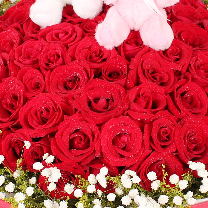 99枝超级红玫瑰,满天星和黄莺围绕。2只小熊