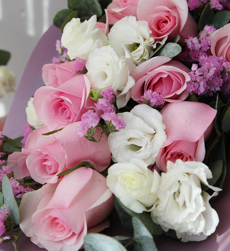 粉佳人或戴安娜玫瑰11枝,白色洋桔梗2枝,粉色勿忘我3枝,尤加利叶4枝