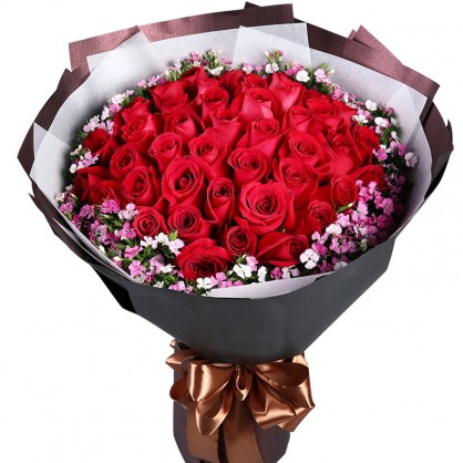 33朵红玫瑰,搭配石竹梅+方形欧式水果蛋糕,各色水果饱满装饰