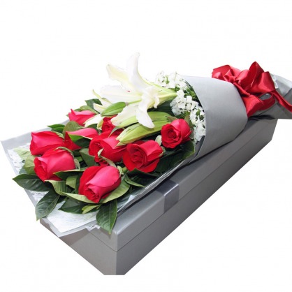 11枝红玫瑰,2枝香水百合,搭配相思梅、栀子叶