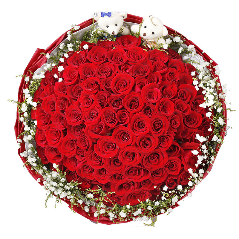 精选99枝靓丽的红玫瑰,2只可爱小熊公仔。